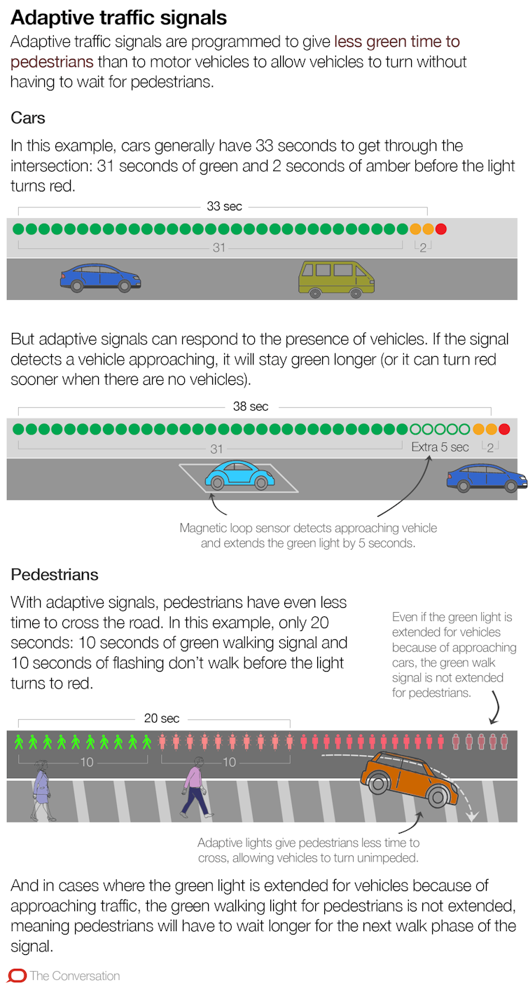 But at many intersections it is worse than that. Traffic signals are set to give less green time to pedestrians on a phase (from the time the light turns green to when it turns red, or from “walk” to “don’t walk”) than to motor vehicles, to give vehicles a protected left turn without having to yield pedestrians. Adaptive signal control also extends the green light for cars when these are detected, but not for pedestrians, who aren’t.